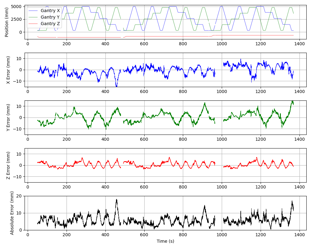 The positioning errors between gantry and OptiTrack data over time can be plotted using the plot_errors.py script: