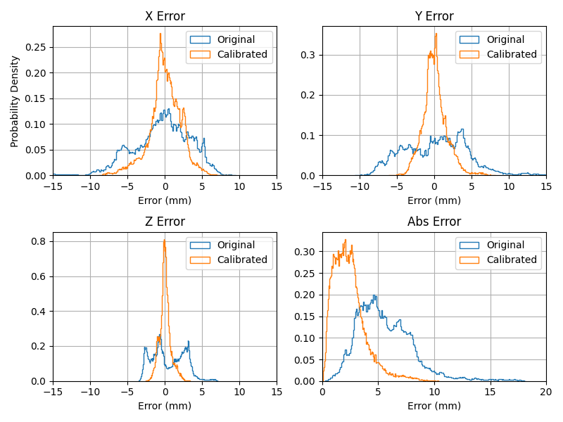 Fig. 41 Positioning errors probability distributions showing the statistical distribution of positioning errors after calibration for each axis.¶