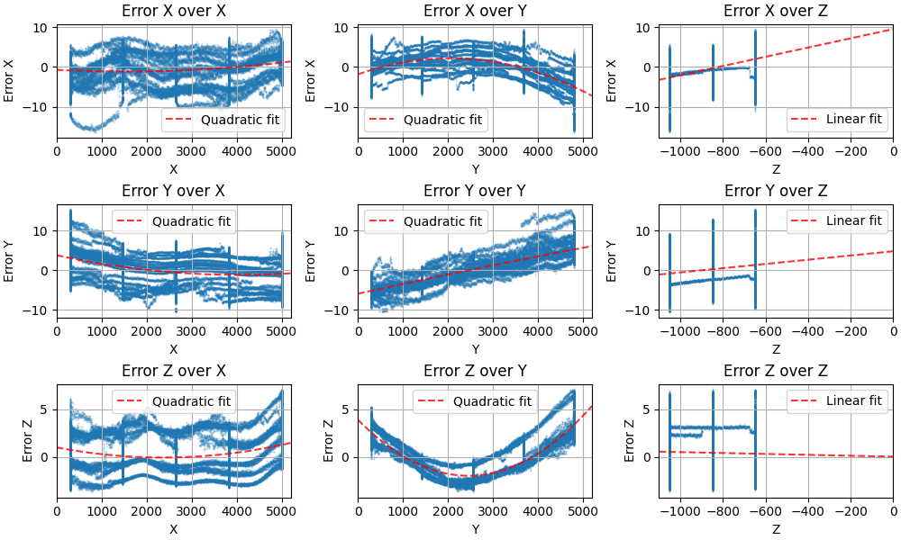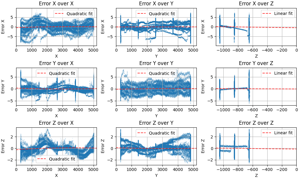Fig. 39 Positioning errors scatter plots before calibration correction, revealing systematic patterns in positioning deviations across the workspace.¶