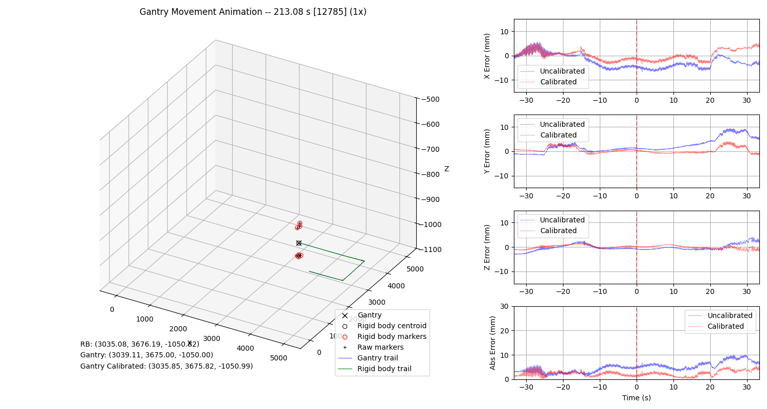 Remember that the calibration process assumes that the gantry data is the commanded position of the gantry robot and the OptiTrack data is the actual position of the gantry robot. After the calibration is complete, the scripts that evaluate the calibration results correct the OptiTrack data with the calibration parameters.