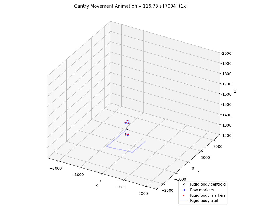 The raw gantry and OptiTrack data can be visualized using the plot_movement_gantry.py and plot_movement_optitrack.py scripts, respectively. For example, to visualize the OptiTrack data, run: