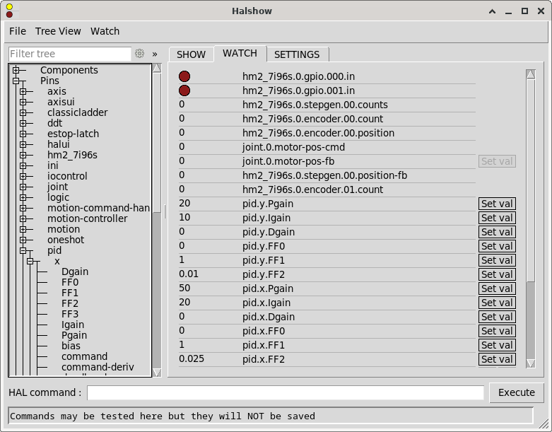 Several HAL tools are available for real-time visualization and diagnosis of pin states. The most notable ones are described below; for a complete list of tools, consult the LinuxCNC user manual [lin23].